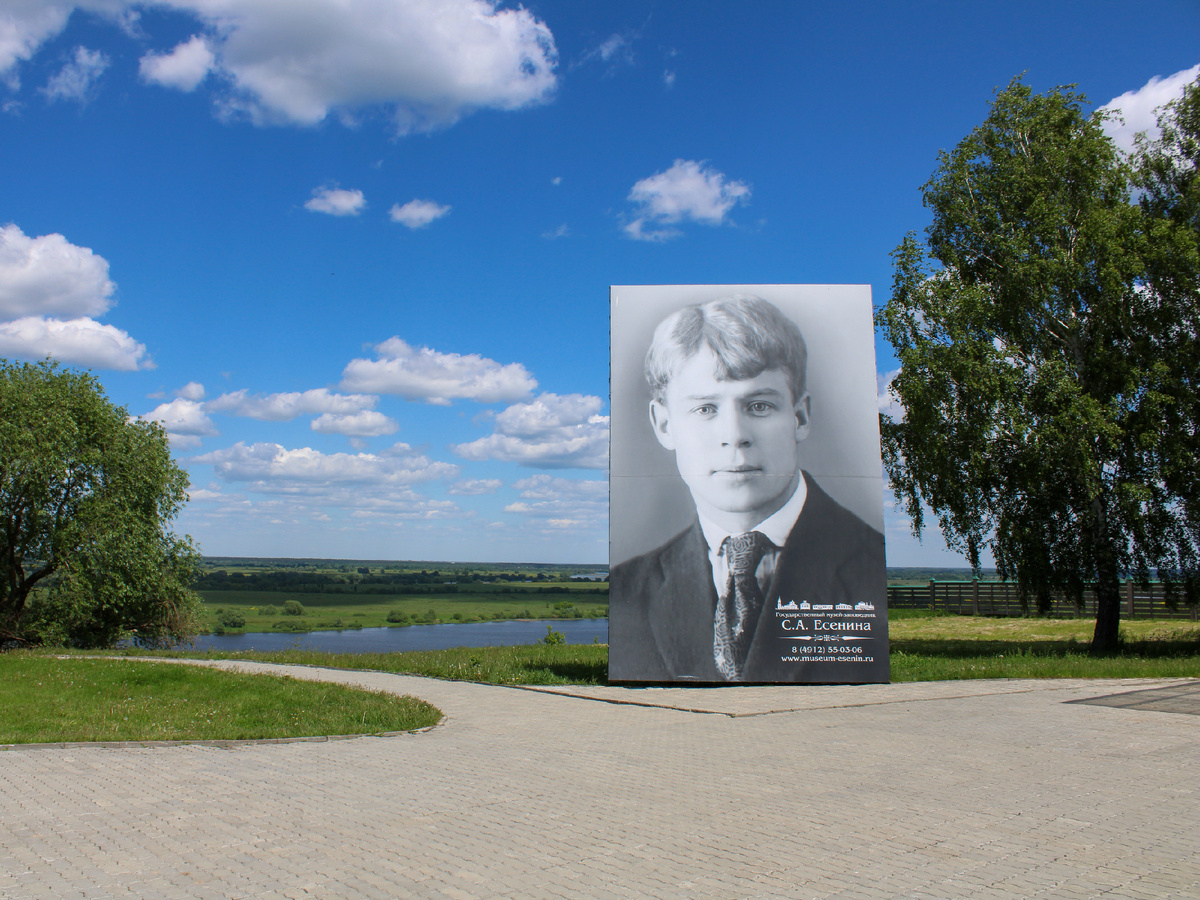 Посетили музей-заповедник в Константиново в июне. Лето - идеальное время для прогулки в музее-заповеднике. В Константиново мы провели целый день. До музея-заповедника доехали на такси из центра Рязани. Вернуться в Рязань оказалось намного сложнее, чем уехать из города. Вызвать такси через агрегатор в Константиново проблематично. В населённом пункте мало водителей. Точнее, вечером был только один. Около музея-заповедника висело объявление с предложением услуг такси (местного жителя), но мы побоялись ехать с незнакомым человеком. Через агрегатор хоть можно отследить машину. Режим работы: ежедневно с 10:00 до 18:00. Касса работает до 17:00. Вход на территорию музея-заповедника платный. Билет стоит 300 рублей. Мы купили два единых билета стоимостью 600 рублей. Портрет поэта за Литературным музеем: Ттерритория очень большая. В первую очередь мы решили погулять и полюбоваться живописными пейзажами. Музей-заповедник находится на возвышенности, но можно спуститься к реке. Н
