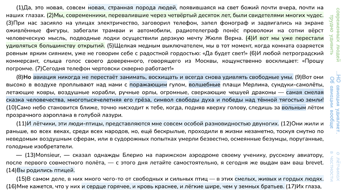 Далее автор говорит про летчиков, которые ему «представляются совсем особой разновидностью двуногих». В них много чего-то от птиц: смелость, гордость, стремление к свободе, «в движениях — уверенная стремительность вперёд». Эти люди смогли преодолеть страх высоты, поэтому они вызывают восхищение. Становится очевидно, что летчики отличаются своей внутренней силой и храбростью, которая поражает других людей.