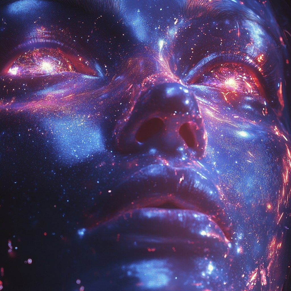 Создано на основе запроса: Close-up of a glowing humanoid face with emotional expression, eyes filled with starlight and glitch particles