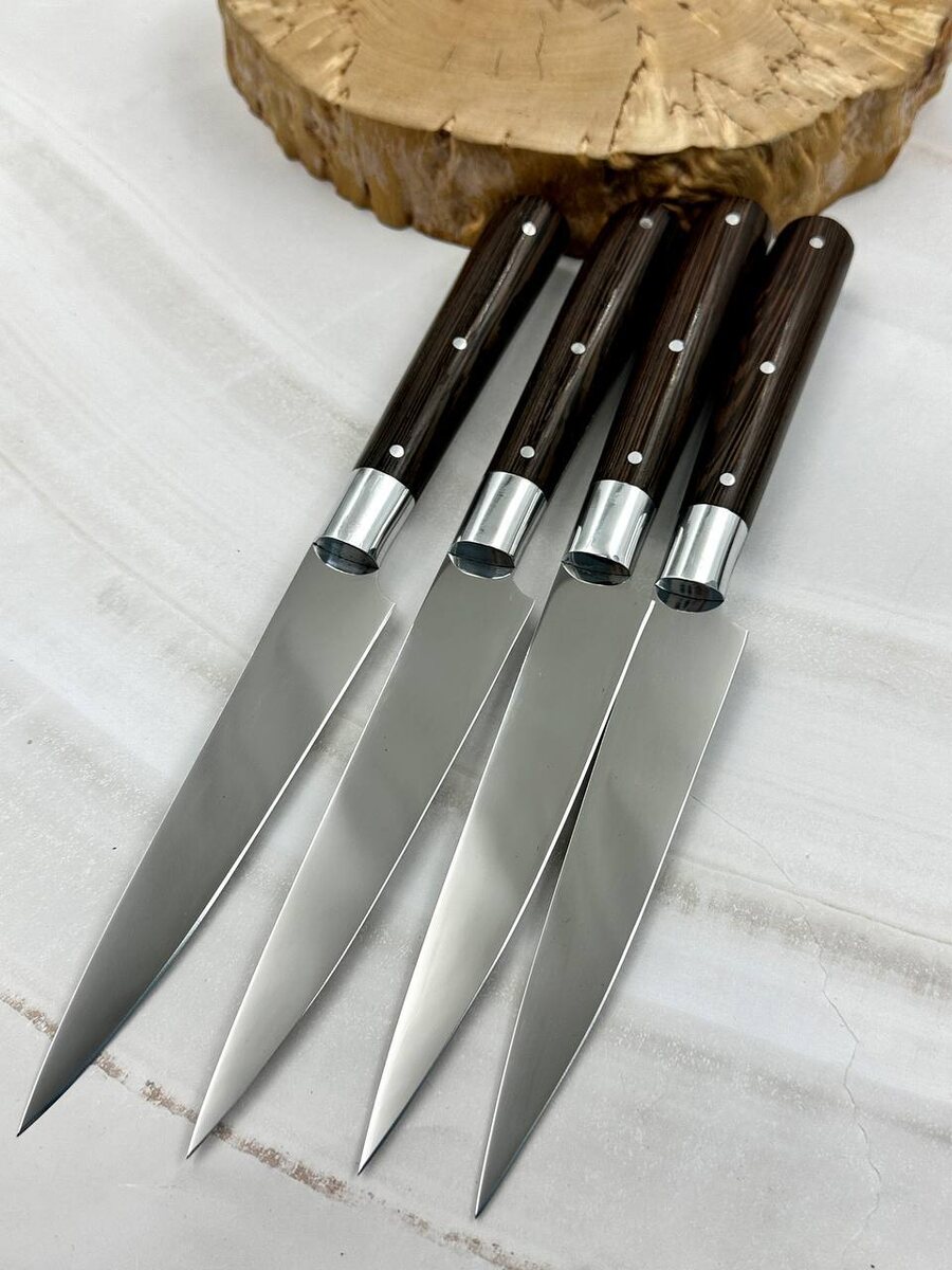 Четыре кухонных ножа в свободной продаже. Все четыре ножа цельнометаллические из стали х12мф с крио. Полные спуски от обуха. Накладки на каждом ноже выполнены из африканского дерева венге. Ножи заточены в бритву. Твердость каждого клинка (HRC): 61-62 Цена за нож: 9.500 рублей. Цена за комплект: 36.000 рублей. В комплекте идут ножны из натуральной кожи. Можем сделать формованные ножны +8000 рублей. Для заказа писать на @Nazarklinokbot или по тел +79101343831 WhatsApp/Viber