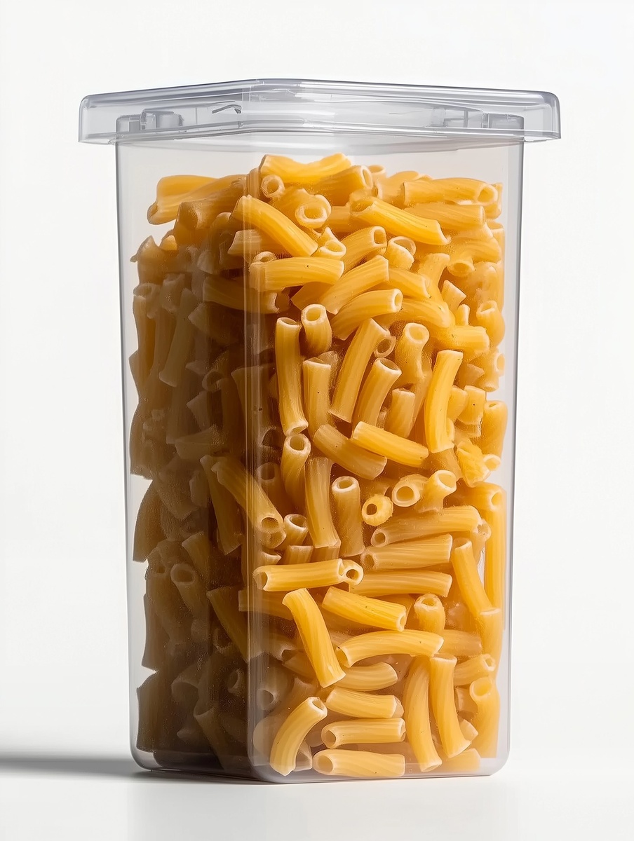 Создано на основе запроса: Real shot, pure white background, with a tall rectangular plastic storage jar at a 45° angle with macaroni