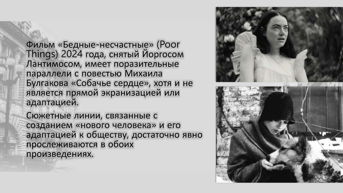 Год назад вышел фильм-номинация на Оскар 2024 за лучший фильм. А Эмма Стоун получила Оскар за лучшую женскую роль. Фильм был снят по одноимённому роману Аласдера Грея и имеет некоторые отличия от того, как оригинальная история была представлена в книге. Стоит отметить, что тем, кто читал книгу, фильм не особо понравился, но это довольно популярная ситуация в отношении экранизаций. Лично для меня этот фильм стал одним из лучших просмотренных фильмов в 2024 году и попал в отдельную подборку: Если говорить о повести М. Булгакова, то она всегда была и до сих пор остаётся одним из самых нелюбимых мной произведений. Но во время выполнения задания на сессию мне пришла мысль о том, что фильм Йоргоса Лантимоса имеет много общего с романом М. Булгакова. Оба произведения начинаются с создания нового человека, который в силу своего происхождения не вписывается в общепринятые рамки и отличается от людей того общества, в которое попадает. В каждой из историй этот новый человек проходит определённый