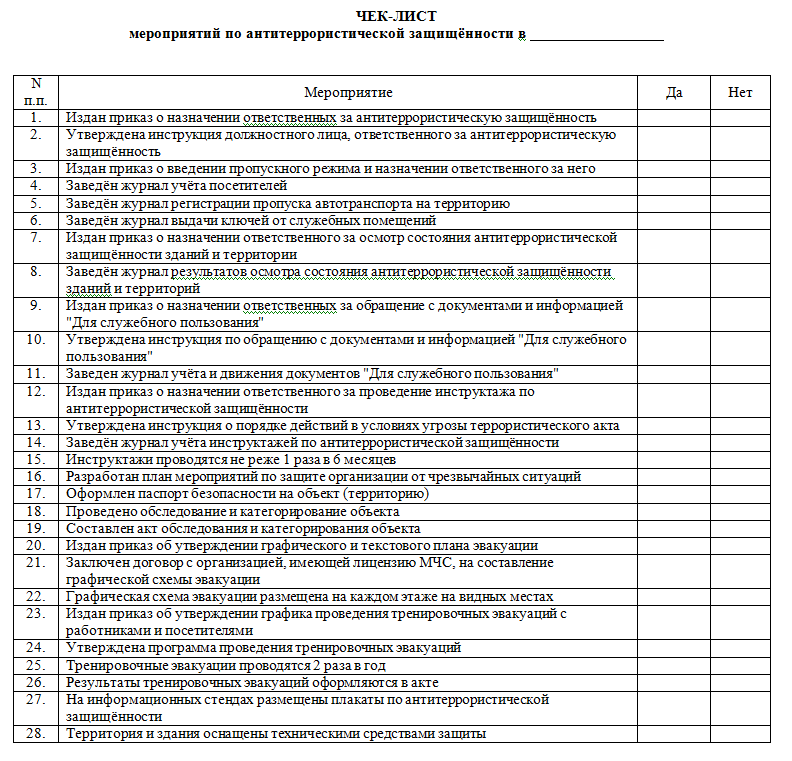 Рост угроз террористических актов в общественных местах и на объектах инфраструктуры требует от организаций строгого соблюдения норм антитеррористической безопасности. Согласно ст. 5 Федерального закона № 35-ФЗ «О противодействии терроризму», юридические лица обязаны принимать меры по защите своих зданий и сотрудников. Однако на практике многие компании сталкиваются с вопросом: Какие документы необходимы для выполнения этих требований? Законодательство РФ обязывает организации: - Разрабатывать Паспорт безопасности объекта (для категорированных объектов); - Внедрять План мероприятий по антитеррористической защищённости; - Вести журналы учёта посетителей и контроля доступа; - Проводить регулярные инструктажи сотрудников. Ключевые документы: - Федеральный закон № 35-ФЗ; - Постановление Правительства № 272 «О требованиях к антитеррористической защищённости объектов»; - Отраслевые приказы Минтранса, Минкультуры и других ведомств. Для упрощения соблюдения требований эксперты рекомендуют исп