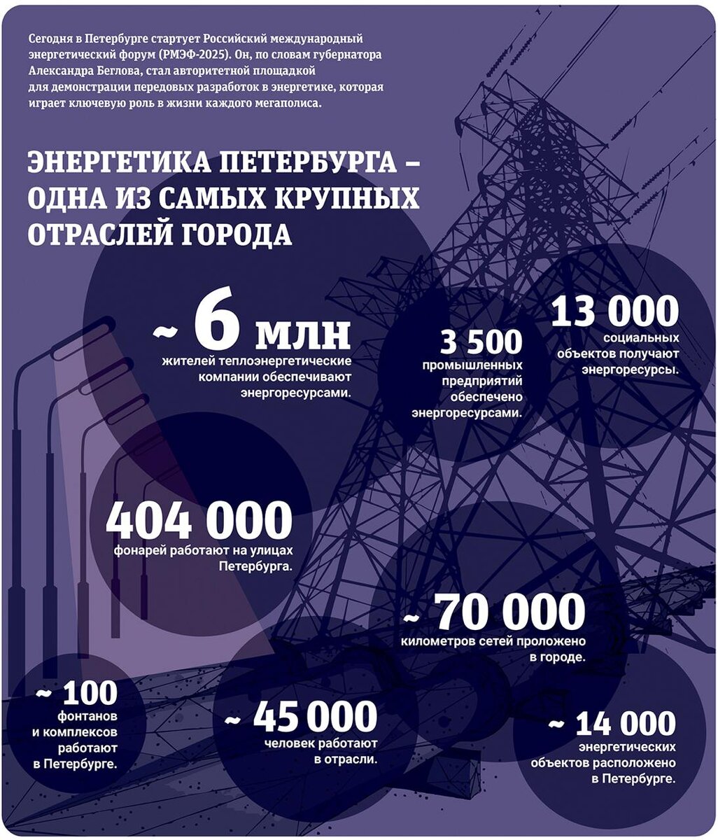 ⚡ Петербург представит передовые разработки на Российском международном энергетическом форуме Сегодня в Санкт-Петербурге на площадке КВЦ «Экспофорум» стартует Российский международный энергетический форум 2025 — одно из крупнейших отраслевых мероприятий в стране. Губернатор Санкт-Петербурга Александр Беглов отметил, что Форум стал важной площадкой для демонстрации передовых разработок в сфере энергетики. «Энергетический сектор Санкт-Петербурга играет ключевую роль в укреплении российской энергетики и научно-технического потенциала страны», — подчеркнул глава города. В рамках форума город представит свои достижения в области энергосбережения и повышения энергоэффективности, а также обсудит управление ресурсами и стратегии развития. Особое внимание на форуме будет уделено подвигам ленинградских энергетиков в годы Великой Отечественной войны. В честь 80-летия Победы представлена экспозиция «Энергия Победы. Восстановление», которая расскажет о подвиге энергетиков блокадного Ленинграда.