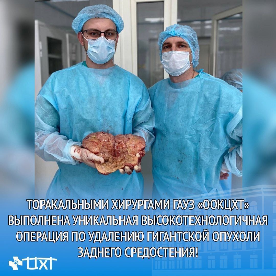 Оренбургские хирурги Олег Трошков и Михаил Федоров удалили из груди 50-летнего пациента гигантскую опухоль Мужчина поступил в хирургическое торакальное отделение областного центра хирургии и травматологии с жалобами на одышку, дискомфорт в грудной клетке и отёки ног.В ходе обследования врачи диагностировали у пациента огромную опухоль в груди. Хирурги провели операцию и удалили новообразование. Мужчина чувствует себя намного лучше.