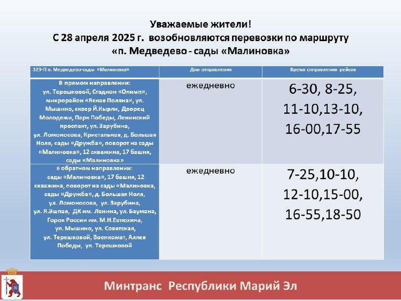 Минтранс Марий Эл опубликовал расписание движения автобуса из Медведево в сады "Малиновка". Он начнет работать с 28 апреля 2025 года.