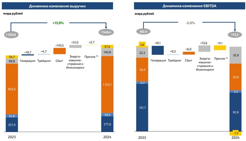 ℹ️ Интер РАО. Отчет МСФО за 2024 г. Прекрасное далеко. Чистая прибыль = 147,5 млрд руб или 1,4 руб на акцию (+8,5% к прошлому году). Из этой картинки мы видим, что две трети выручки идет от низкодоходного сбыта, который приносит лишь треть EBITDA. Почти половину EBITDA обеспечивает генерация, дающая всего 18% выручки. «Подсела" генерация из-за окончания сроков ДПМ. Капитал подрос на 12% до 1039 млрд руб. или 10 руб на акцию. Чистый долг почти без изменений – минус 415 млрд руб. Капитальные вложения выросли на 72% с 67 до 115 млрд руб., что гораздо ниже планов. Основное направление капзатрат - строительство Новоленской ТЭС в Якутии. Кубышка размером 523 млрд руб принесла процентные доходы на 82,5 млрд руб. Обзор всего сектора электрогенерации, включая Интер РАО, - в бесплатном доступе на Sponsr. Текущая капитализация на 09.04.2025 г. при цене акций 3,4 руб. равна 355 млрд руб. P/E = 2,4. P/B = 0,34. Совет директоров в полном соответствии с дивполитикой (25% прибыли по МСФО) реком
