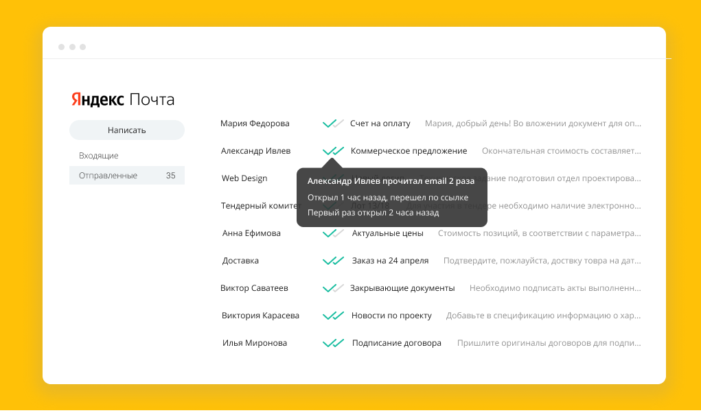 Очень просто! Для этого мы сделали сервис Mailscan.me. Получайте уведомления об открытиях писем и о переходах по ссылкам из писем. Вот ссылочка: mailscan.me Это расширение для браузеров Google Chrome, Яндекс Браузер, Opera устанавливается в один клик. Работает с Яндекс Почтой. 1. Установите расширение Mailscan. 2. Пишите письма, как обычно на любые адреса и вам будут приходить уведомления о прочтении и кликах по ссылкам из писем. После установки расширения, в интерфейсе почты появится кнопка: Посмотреть, что письмо прочитали можно двумя способами: галочки в почте и входящие письма-уведомления от Mailscan. В меню слева появится две галочки, они говорят, о том, что у вас установлен Mailscan. В отправленных теперь будут показываться галочки рядом с получателем. Статус, как везде: одна зеленая, одна серая – письмо не прочитано; две зеленых – письмо прочитано. Галочки также дублируются во входящих, если с получателем письма состоялся диалог. Если навести курсор на галочки, то появится подс