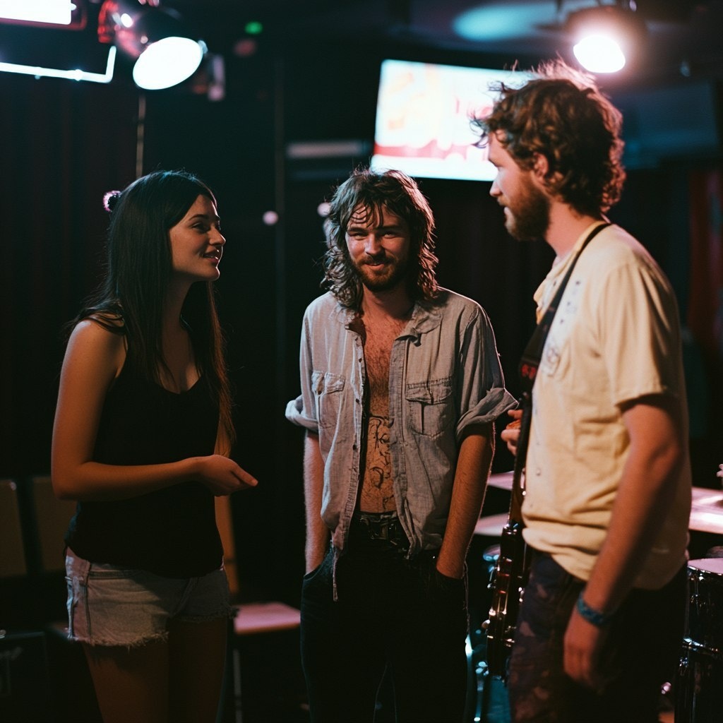 Создано на основе запроса: Cinematic scene. Australia. Wide shot. Colour. Small music venue. Daytime. Just in front of the stage. A disheveled 35 year old rockstar talks to a 30 year old female venue manager and a 30 year old musician. --- Автоперевод: Кинематографическая сцена. Как тебе эта картинка? 🤔 https://dzen.ru/id/65c0c65c86e4f837c27b24d7 #ИИ #AI #нейросеть #midjourney #art