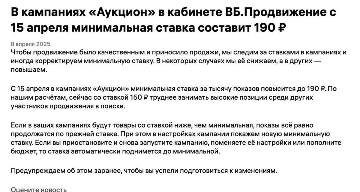 “Чтобы вы занимали места повыше” — WB снова поднимает ставки С 15 апреля на Wildberries минимальная ставка в рекламных кампаниях типа “Аукцион” увеличивается с 150 ₽ до 190 ₽ за 1000 показов. WB объясняет это так: «С нынешними ставками тяжело занимать высокие позиции». 🤔 Звучит странно. Аукцион — это и есть про конкуренцию. Если в нише высокая конкуренция — ставки сами вырастут. Если нет — зачем их искусственно поднимать? Кажется, причина тут совсем не в “качесте продвижения”. Просто кто-то хочет зарабатывать больше с каждой 1000 показов. Всё. WB продолжает медленно, но уверенно завинчивать рекламные бюджеты. А селлерам остаётся либо платить, либо выпадать из выдачи. Готовьтесь. Или тестируйте другие каналы — SEO, внешку, Telegram. Потому что платить по 190 ₽ за ноль продаж — будет больно. Marketplace_biz - отдай свой буст каналу