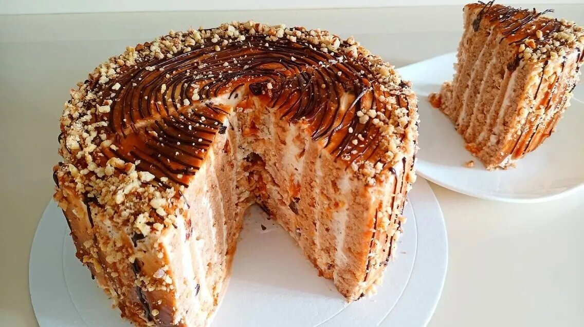 Готовлю торт «трухлявый пень», который был очень популярен в советское время и пользовался спросом среди любителей сладкой выпечки с кремом. Трухлявый пень традиционно готовится из бисквитных коржей на домашнем варенье, сметанным кремом и начинкой с сухофруктами. В качестве декорирования я использовал варёную сгущёнку, шоколадную нитку и грецкие орехи. Торт получил своё название, благодаря внешней схожестью со старым трухлявым пнём, а потому, его форма может быть произвольная, без чётких пропорций и контуров. Лёгкая небрежность в оформлении, только подчёркивает старый спил. Вкус трухлявого пня понравится всем любителям проверенных советских рецептов из простых и доступных продуктов того времени.