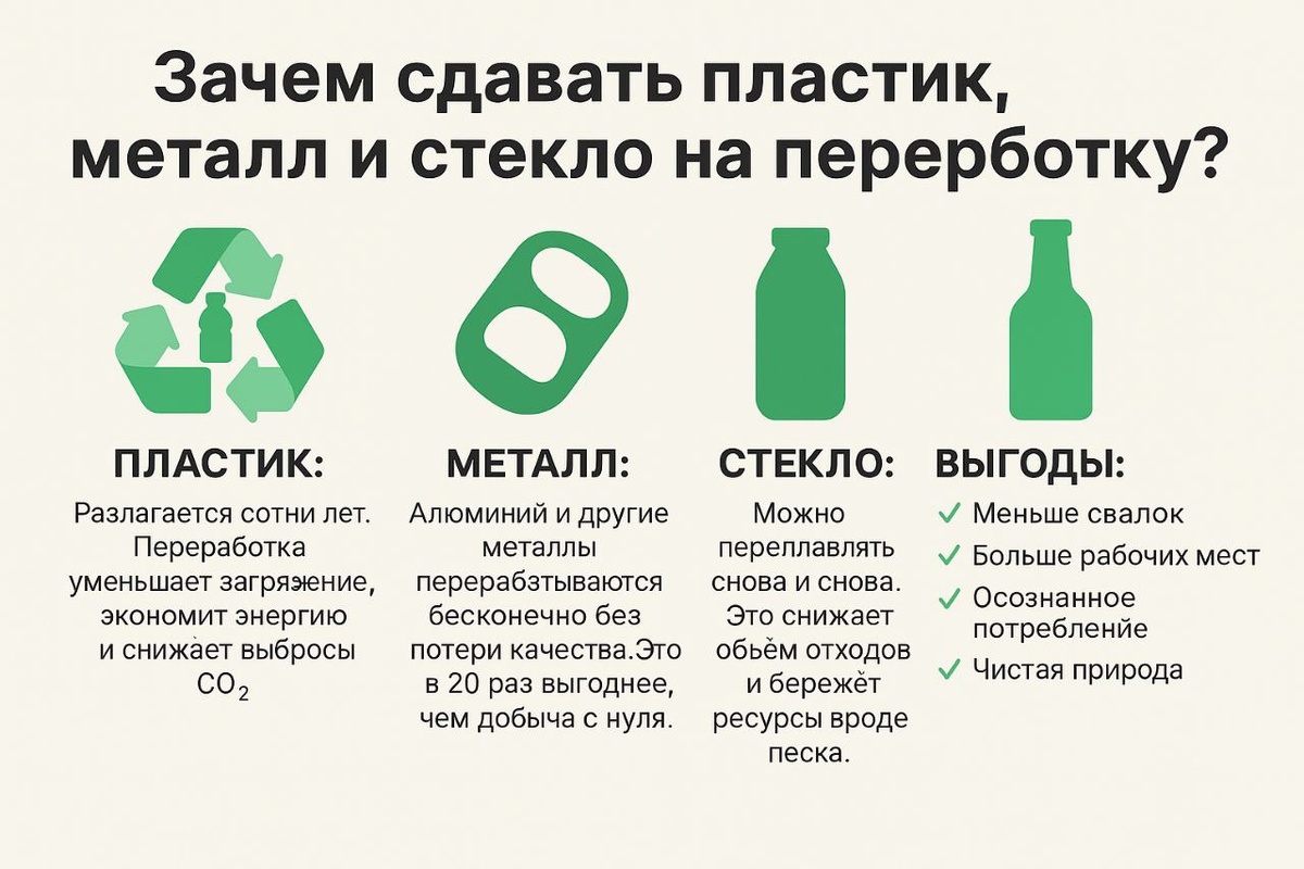 В современном мире вопрос отходов становится всё острее. Мы производим и выбрасываем огромное количество упаковки, не задумываясь, куда всё это девается после. Вторичная переработка — это один из самых эффективных способов уменьшить экологическую нагрузку, сохранить природные ресурсы и поддержать устойчивое развитие общества. Особенно это касается таких повседневных материалов, как пластик, металл и стекло. Пластик: невидимый враг природы Пластик — один из самых проблемных отходов. Он разлагается сотни лет и часто попадает в почву, воду, океаны, где наносит ущерб экосистемам. Вторичная переработка пластика позволяет: 📜уменьшить загрязнение окружающей среды; 📜снизить потребность в производстве нового пластика (на основе нефти); 📜экономить энергию (переработка требует меньше энергии, чем создание с нуля); 📜сократить выбросы парниковых газов. Металл: бесконечно возобновляемый ресурс Металлы — одни из самых ценных и легко перерабатываемых материалов. Алюминий, например, можно перерабат