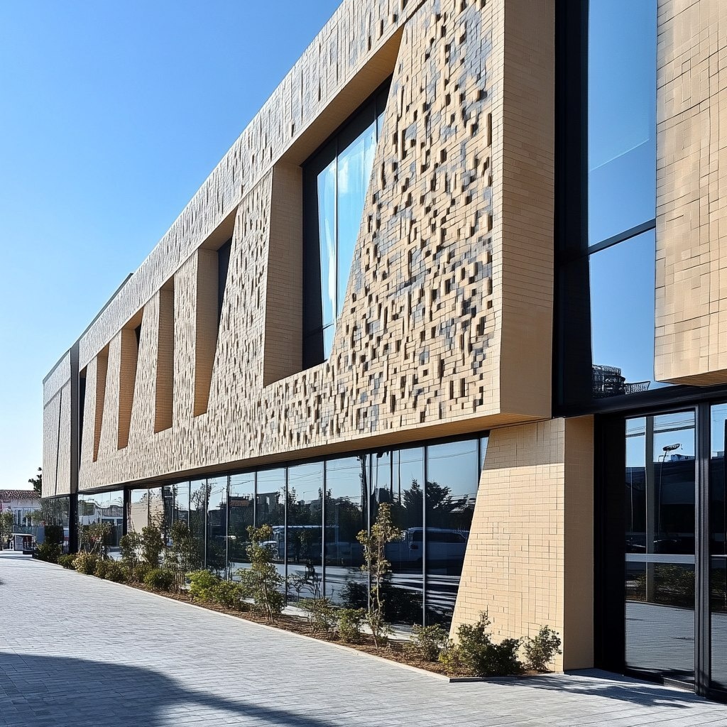 Создано на основе запроса: innovative facade concept of fibre with brick, commercial center, cream