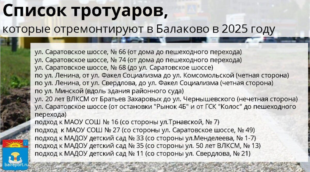 Подведены итоги аукциона по ремонту и устройству тротуаров на территории города Балаково. Об этом сегодня сообщил глава БМР Сергей Барулин и напомнил, что средства на благоустройство выделены из областного бюджета по инициативе губернатора Романа Бусаргина. -Сегодня, 9 апреля, подведены итоги аукциона. Работы по ремонту и устройству тротуаров будет проводить ИП Мартиросян Айказ Гургенович. Подрядная организация должна будет завершить работы до 30 июля этого года. Всего планируется благоустроить 13 пешеходных дорожек, — написал глава в своём ТГ-канале. ИП Мартиросян А.Г. зарегистрирован в г.Пугачёв в 2017 году, является исполнителем 33-х госконтрактов на сумму 91 миллион рублей — ремонтировал дороги и тротуары в Духовницком, Перелюбе, Пугачёве.