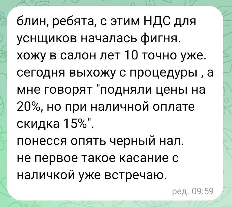 Легенды об НДС для покупателей Вчера хохоталась с этого рассказа. То есть, салон красоты говорит клиентам, что у них НДС появился и поэтому цены из-за него пришлось поднять на 20%, но есть отдельный прайс с ценой, поднятой всего на 5%, в случае, если вы платите кэшем. Кассовый чек девушке на этот кэш не дали. Давайте разбираться. 1. Если верить интернетам - а чему нам верить, кто нам даст статистику - хороший оборот салона, к которому надо стремиться -1 млн.руб.в месяц. Кто-то писал про личный вышерынковый успех в 1,3 млн руб. Значит, в год салон может получить максимум 12-16 млн.руб. Понятно, что есть разные сегменты, какие-нибудь премиумы-спа-люкс-резорты - нет, мы берем очень усреднённое понятие салона Какой "новый" НДС появился с 2025 года? У упрощенцев. У них теперь может быть еще и НДС со ставками 5%, 7% или 20% в зависимости от дохода и выбора - и только у тех, кто за 2024 год заработал более 60 млн.руб.за год, либо у тех, кто в текущем году переваливает за 60 млн. То есть