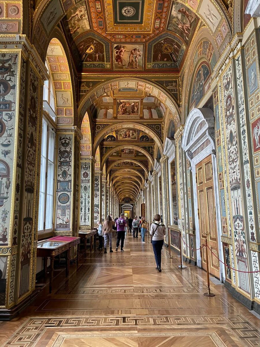 Самая загадочная галерея Эрмитажа. Одно из самых любимых моих мест. Лоджии Рафаэля. Однажды, Екатерина, страдая мигренью, рассматривала альбом с гротесками, где были рисунки лоджий Рафаэля, расположенных в Ватикане. Императрица так увлеклась иллюстрациями, что не заметила, как головная боль прошла. И она захотела создать у себя такое же чудо. Хочу императрицы было удовлетворено. Получено разрешение от Папы на копирование оригинала. Художники направились в Ватикан и копировали фрески на холсты. Предприимчивый Кваренги уже знал о заказе, и спроектировал постройку нового корпуса вдоль Дворцовой канавки. Представил проект Екатерине и сразу стал любимым архитектором. Угодил. Галерея была на для публичных просмотров. О музее речи тогда не было. Естественно, что в Северной столице лоджии в отличие от Ватиканских застеклили. Но освещение даже сейчас минимальное. Никаких дополнительных ламп. В темное время они выглядят очень загадочно. Ни один рисунок не повторяется. На потолке - би