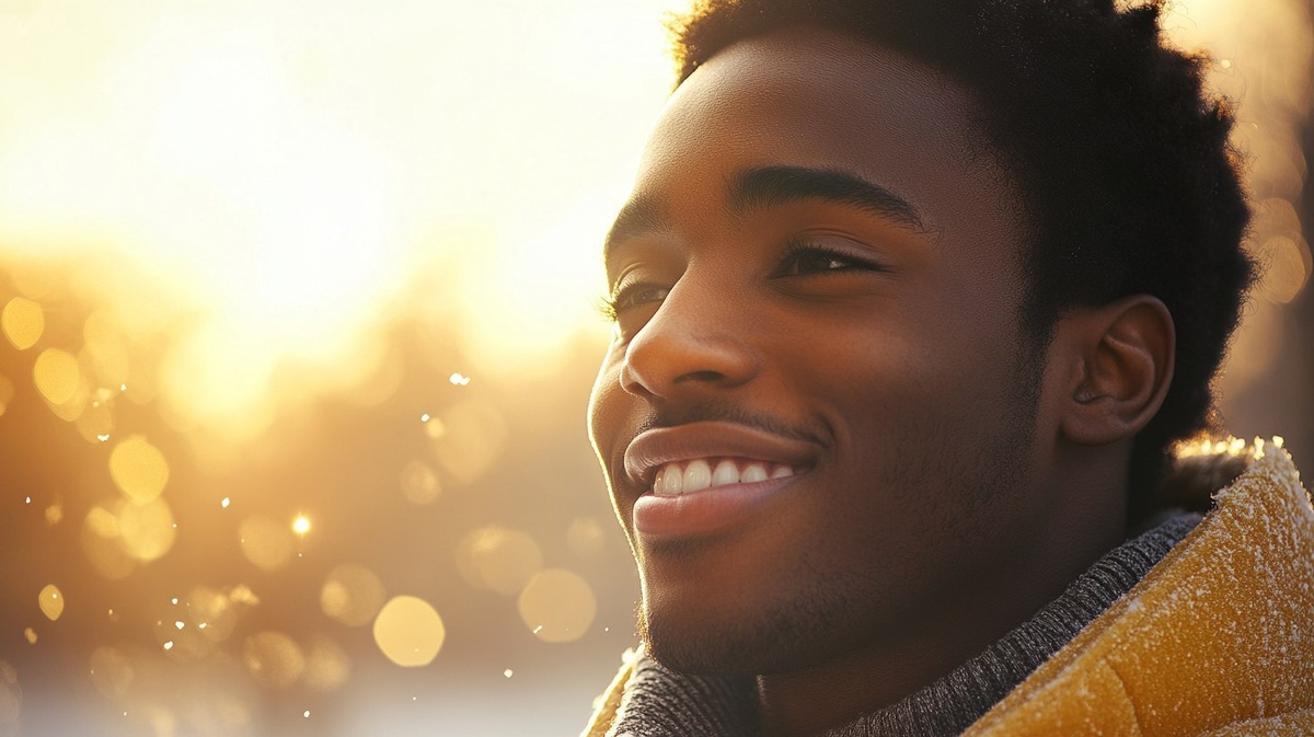 Создано на основе запроса: cinematic portrait of a black man gently smiling, wearing a golden-yellow coat, warm sunlight on his face