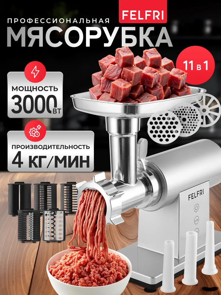 Мясорубка Felfri 11 в 1 отличается широким набором функций, что делает её многофункциональным кухонным устройством. Ниже приведены основные технические характеристики: