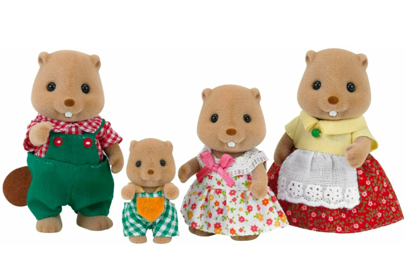 Семей бобров в Сильвании две. О первой, семье Вотерс, я уже рассказывала. Посмотрим на вторую семью, которая появилась позже. Итак, семья Вудбрук. Семья впервые вышла в Японии в 2013 году. Набор состоял из четырех фигурок. Никаких дополнительных наборов с малышами или сыном для этой семьи не выпускали. В 2014 году аналогичный набор выпустили в Англии. Бренд как раз только перешел в ведение Epoch, поэтому фамилию для этой семьи придумывала, вероятно, уже новая команда. Epoch не утруждали себя креативным подходом к фамилиям, потому искать потаенные смыслы не будем. Фамилия распадается на слова «дерево» (wood) и «ручей» (brook), обыгрывая, скорее всего, место обитания бобров. Семью также выпустили для других стран Европы. Этот набор доехал и до России: Выпустили бобров и под маркой Calico Critters: Семья официально выпускалась примерно до 2016 года. Иногда бобров Вудбрук путают с бобрами Вотерс. Сравним семьи и прочувствуем разницу: Вотерсы более темные и реалистичные. Вудбруки светл