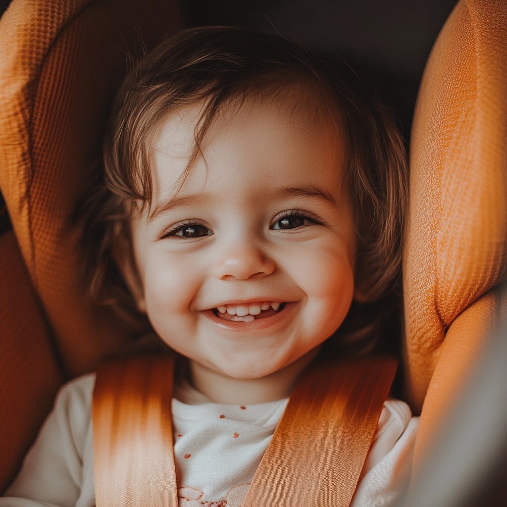 Создано на основе запроса: Create a HD, HQ, minimalist photograph showing a white toddler smiling safely in a car seat, bright colors.