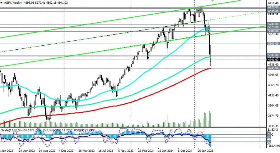 https://basechop.ru/wordpress/?p=37784 Рынки находятся под давлением из-за эскалации торговых конфликтов. В ближайшее время основное внимание будет сосредоточено на возможных смягчающих мерах со стороны ФРС и дипломатической реакции Китая и других пострадавших стран, отметили мы в нашем сегодняшнем обзоре «Доллар и фондовые рынки: торговая политика США усиливает давление на рынки». Так, индекс широкого рынка S&P500 после вчерашней коррекции на фоне сообщения СМИ о том, что Трамп может отложить введение объявленных им накануне взаимных пошлин на 90 дней. Однако, энтузиазм участников рынка быстро иссяк после того, как в Белом Доме заявили, что они не слышали о таких разговорах Трампа. Фьючерсы на индекс S&P500 торгуются в первой половине европейской торговой сессии среды в районе отметки 4940.00, вновь снижаясь в сторону ключевого долгосрочного уровня поддержки 4745.00 (ЕМА200 на недельном графике). Если, прежде всего из США, не начнут поступать смягчающие сигналы относительно «тарифов