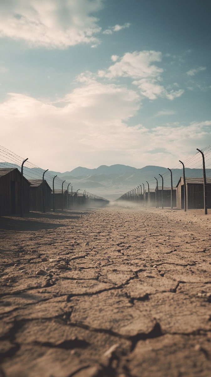 Создано на основе запроса: A desolate desert landscape during World War II, endless rows of wooden internment camp barracks stretching across the sand, blowing dust and sand swirling in the dry wind, harsh sunlight casting long shadows, barren terrain with cracked earth, barbed wire fences in the distance, historical 1940s atmosphere, muted earthy tones, cinematic wide-angle view, emotional silence