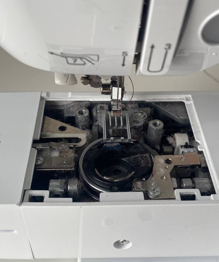 Отключите швейную машину из сети, снимите лапку и открутите игольную пластину. Затем смахните всю пыль с помощью специальной кисточки и уберите пинцетом весь лишний ворс. Подробно показали порядок действий вот в этом видео.