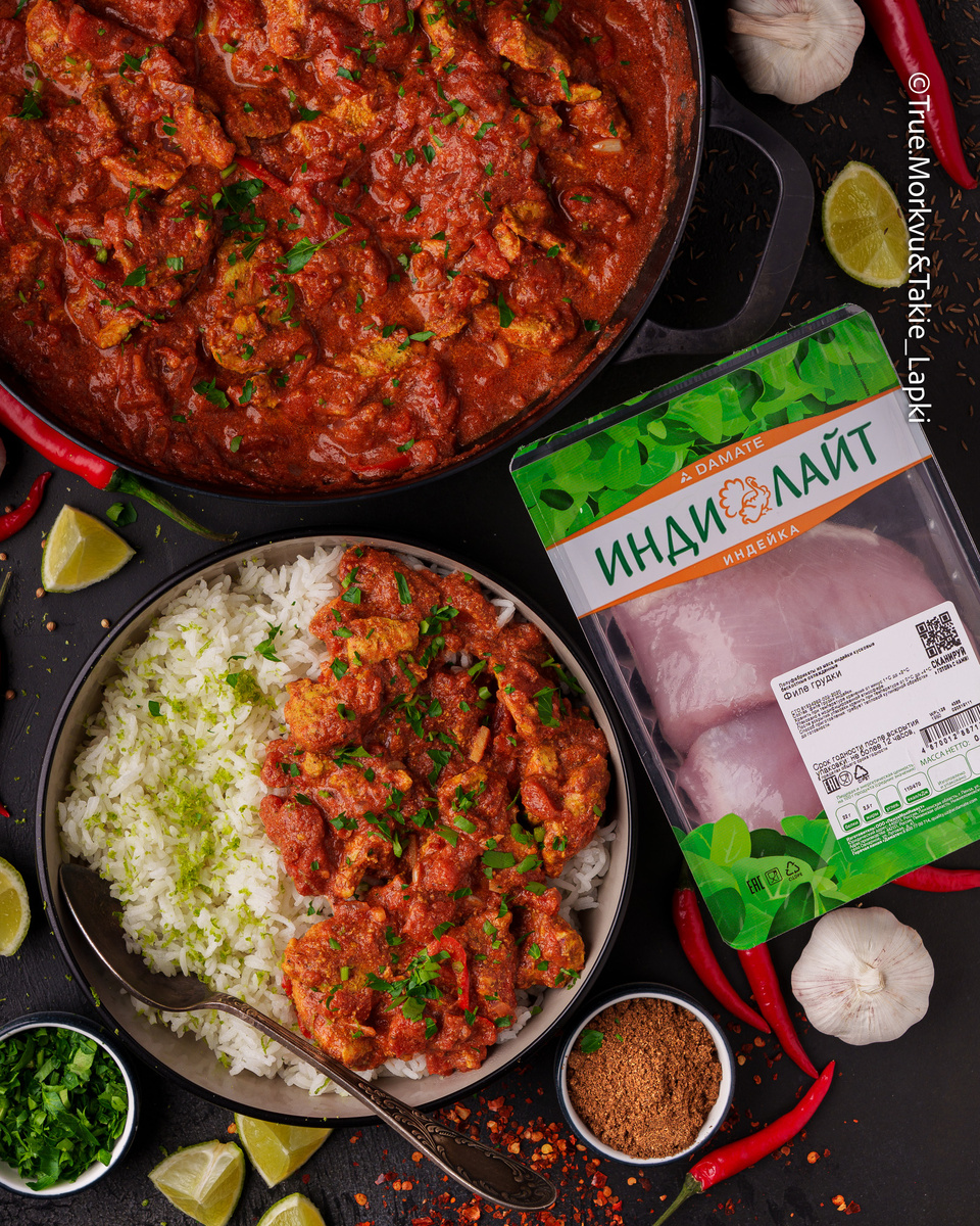 Название блюда говорит о том, что в него входит смесь Гарам Масала. Если ее нет, берите обычное желтое карри, с ним будет тоже вкусно. За мясную часть отвечает филе индейки Индилайт. Нежный вкус мяса не конфликтует с насыщенными специями, поэтому блюдо получается многогранным и быстрым. Идеально для ужина.