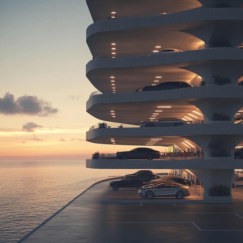 Автоперевод: Парковное здание с вместимостью 350 автомобилей, вдохновленных современной архитектурой, в том числе 4 этажа и рампы, с припаркованными автомобилями на каждом этаже, в том числе бар -ресторан на крыше, перед Средиземным морем, архитектурное рендеринг реалистичный снимок на беззаботной камере, DSLR, 35 -мм объектив F/2.8.