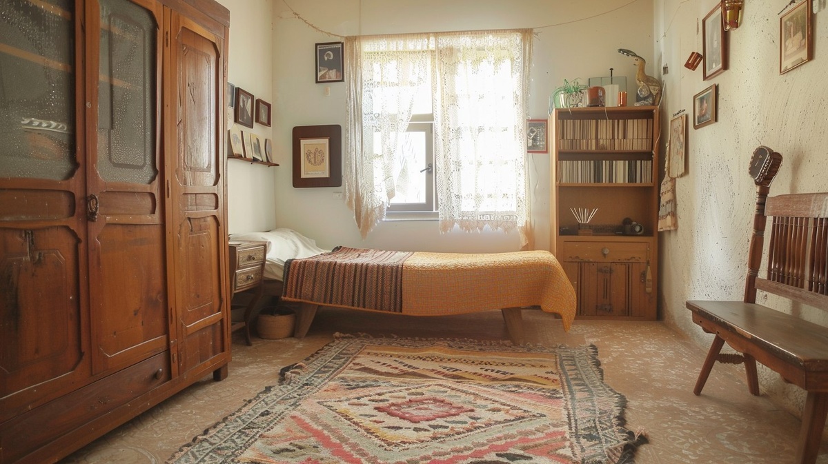 Создано на основе запроса: A traditional Jewish bedroom in a 1970s moshav house. The room features a simple wooden bed with a colorful woven blanket, a wooden wardrobe, and shelves filled with religious texts. The walls are adorned with framed Hebrew letters and a small menorah sits on a wooden nightstand. The floor is covered with a woven rug, and a window with lace curtains lets in soft, natural light. --- Автоперевод: Традиционная еврейская спальня в мошавском доме 1970 -х годов. Отлично выглядит? 🤔 https://dzen.ru/id/65c0c65c86e4f837c27b24d7 #ИИ #AI #нейросеть #midjourney #art
