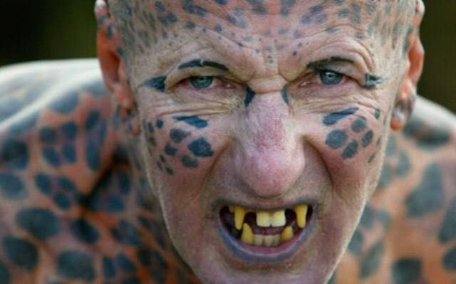 Самые татуированные люди планеты. Том Леппард Практически 28 лет англичанин Том служил в армии Великобритании, но в какой-то момент, когда пришло время окончания службы, он осознал, что общество гражданских людей ему не близко, и он просто не сможет жить в их окружении. Приняв решение сбежать от цивилизации, он сделал себе татуировок на 10000 долларов и переместился от благ цивилизации на остров Скай. Тату покрыли практически все его тело, «живое место» осталось только на внутренней поверхности ушей и между пальцами ног. В свое время Том был признан книгой рекордов Гиннеса самым татуированным человеком в мире, но вскоре его рекорд был побит. Мужчина превратился в леопарда, даже клыки себе вставил такие же, как у этого животного. Из одежды на нем всегда была только набедренная повязка. Кажется, что если их всех вместе собрать, будет неплохая команда люди X)