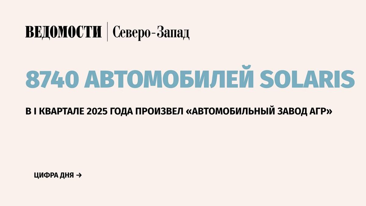 Новый собственник бывшего автозавода Hyundai в Петербурге «Автомобильный завод АГР» за I квартал 2025 г. произвел 8740 автомобилей Solaris. С 1 апреля автозавод перешел на новую скорость производства, предприятие начало ежедневно выпускать по 240 автомобилей, сообщили в пресс-службе компании. ⚪️За январь-март 2025 г. было реализовано 5400 автомобилей. Количество регистраций моделей бренда за этот период составило 4013 штук. ⚪️Генеральный директор «АГР Холдинг» Алексей Калицев отметил, что в I квартале 2025 г. результаты продаж автомобилей бренда Solaris, несмотря на значительное сокращение российского автомобильного рынка, выглядят очень достойно. 💭«Мы смогли не просто закрепить свои позиции, но реализовать свои обещания о расширении доли рынка, по результатам марта заняв 2% и войдя в топ-10 марок», – сказал он. 📰 Подпишитесь на «Ведомости Северо-Запад»