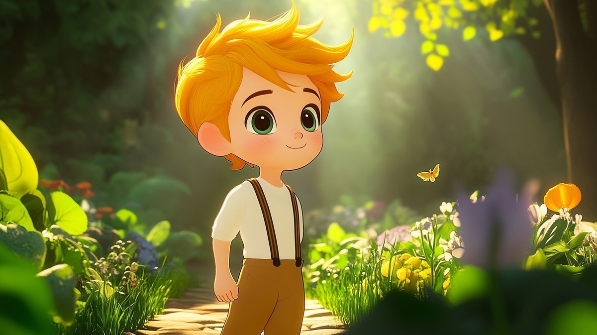 Создано на основе запроса: A curious and excited young boy named Ferman walks into his grandfather's garden for the first time that