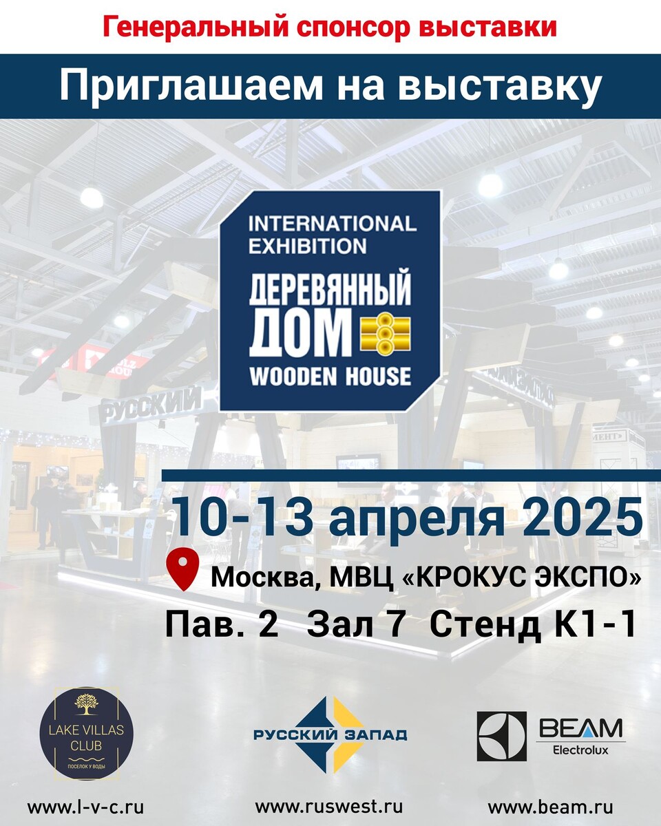 Друзья, приглашаем вас на выставку «Деревянный Дом. Весна 2025», где соберутся ведущие российские и мировые производители, поставщики, строители, архитекторы и дизайнеры. На выставке будет представлен весь спектр передовых архитектурных и технологических решений для сектора строительства частных жилых домов из дерева. 🔥Здесь можно выбрать проект будущего деревянного дома или бани, подобрать средства защиты, отделки и ухода за древесиной.⠀ ❗️Компания «Русский Запад» — генеральный спонсор мероприятия. На нашем стенде вы увидите: ✅деревянные дома собственного производства, ✅встроенные пылесосы Beam Electrolux, ✅коттеджный посёлок бизнес-класса Lake Villas Club. ⠀ 🔹Когда: С 10 по 13 апреля 🔹Где: МВЦ «Крокус ЭКСПО»⠀ До встречи в Крокус-Экспо! ⠀