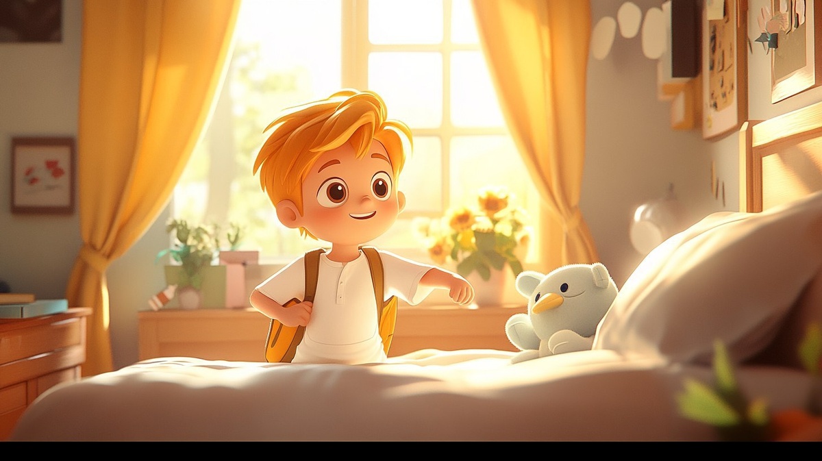 Создано на основе запроса: A cozy children's bedroom in soft morning light. A 7-year-old boy named Ferman is waking up with a smile as sunlight filters through the curtains. He stretches in bed, then starts getting ready for school