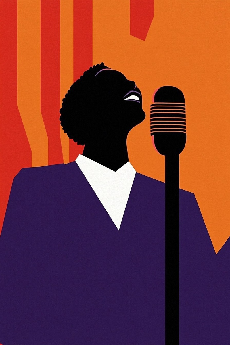 Создано на основе запроса: afro modern flat art, black womansinging on a large standing microphone