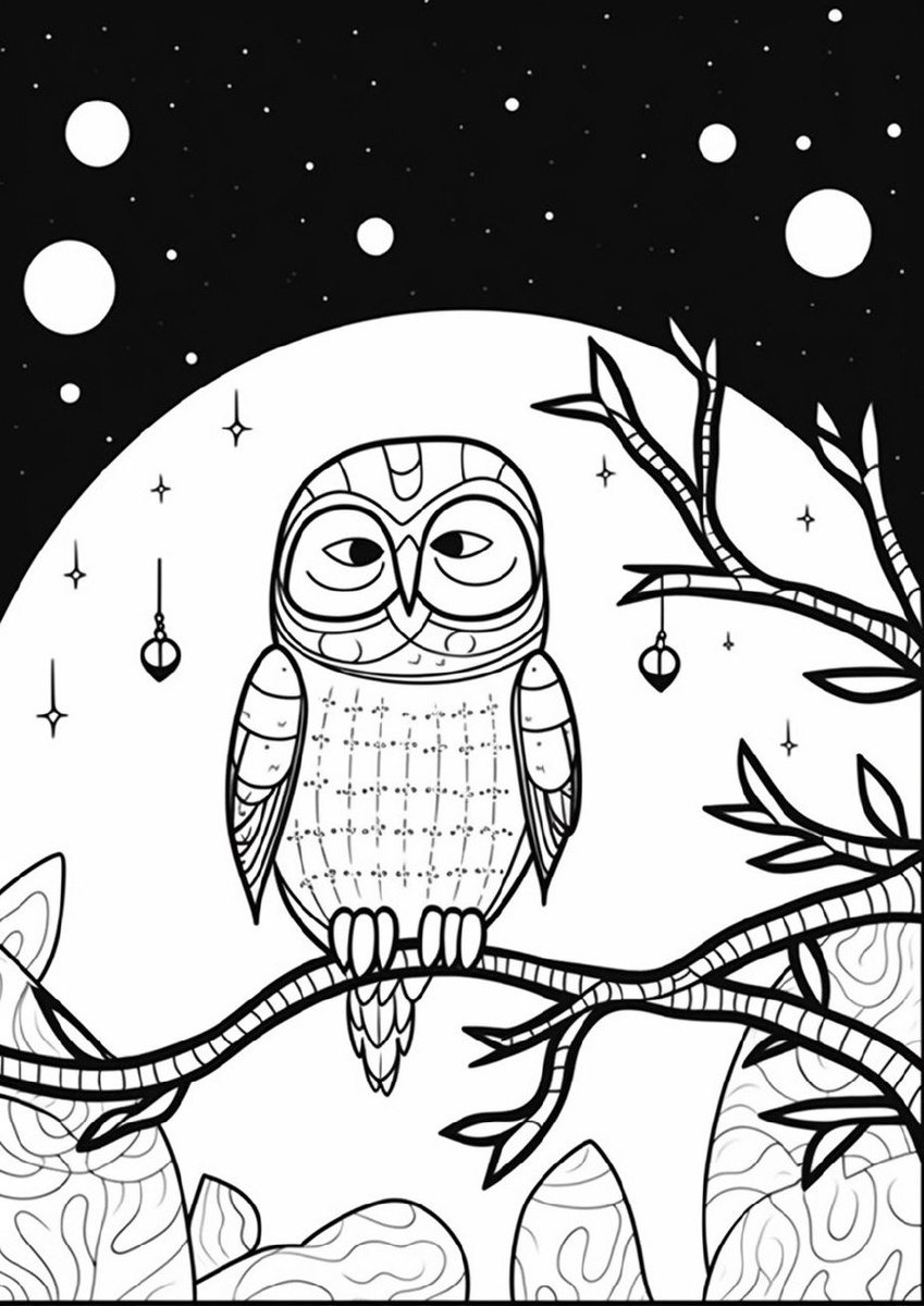 Создано на основе запроса: Children's coloring page, a cartoon-style barred owl sitting on a tree branch at night, stars and moon in
