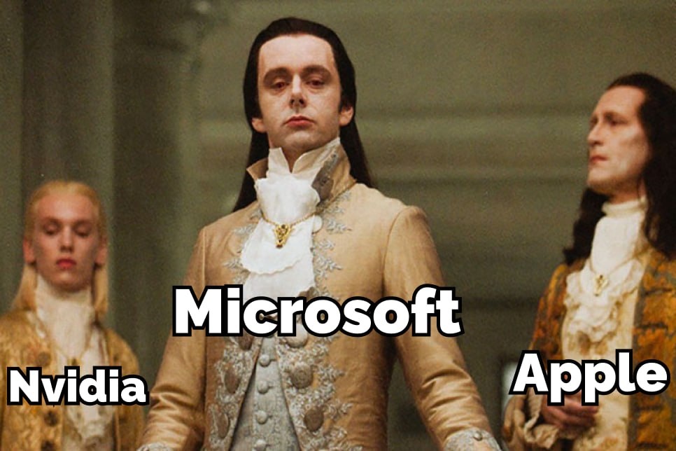 Стоимость Microsoft теперь составляет $2,64 трлн, а Apple всего $2,59 трлн. Стоимость бумаг «Яблока» упала сразу на 23% за последние четыре сессии из-за торговых пошлин Трампа. В тройку лидеров также вошла Nvidia стоимостью $2,35 трлн.