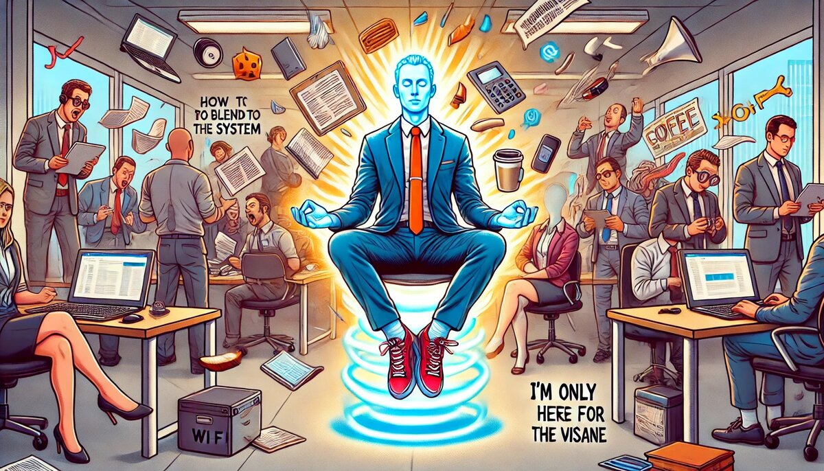 Ты как два в одном: и сотрудник месяца, и анархист в отпуске. Главное — не вставать во время созвона. Ни при каких обстоятельствах. Ты сдаёшь отчёты.
