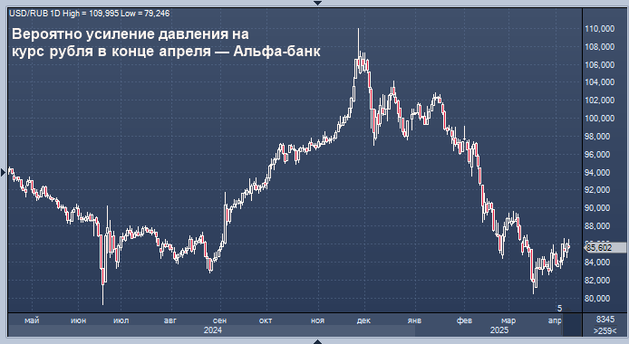 Вероятно усиление давления на курс рубля в конце апреля — Альфа-банк Курс доллара к рублю расчётный, фьючерс, вечный фьючерс и межбанк. Курс евро к рублю расчётный, фьючерс, вечный фьючерс и межбанк. Курс юаня к рублю биржевой, фьючерс, вечный фьючерс и межбанк. Вероятно усиление давления на курс рубля в конце апреля, полагают экономисты Альфа-банка Наталья Орлова и Валерия Кобяк. Согласно данным ЦБ РФ, продажи валюты со стороны крупнейших экспортеров в марте снизились до $10,2 млрд с $12,4 млрд в феврале на фоне снижения цен на нефть, отмечают аналитики в обзоре банка. При этом в марте население не проявляло особой активности на валютном рынке - граждане в марте продали валюты всего на 0,2 млрд руб. по сравнению с покупкой на 6,5 млрд руб. в феврале. В то же время регулятор отмечает, что укреплению рубля способствовали устойчивый спрос на рублевые активы и ослабление доллара относительно основных мировых валют на фоне роста опасений рецессии в США. "С учетом подготовки к продолжительн