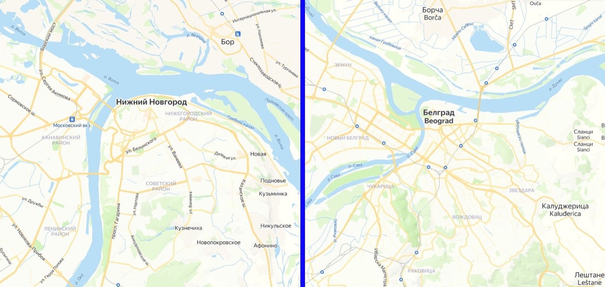 Причем оба города расположены к югу от крупных рек, но на обоих берегах Оки и Савы соответственно. На противоположной стороне Волги и Дуная – города-спутники, [внезапно!] Бор и Борча. Разве что из сербской столицы на другой берег Дуная можно добраться по двум мостам, из новой части города и из старой, тогда как в Нижем вместо второго моста – канатная дорога.