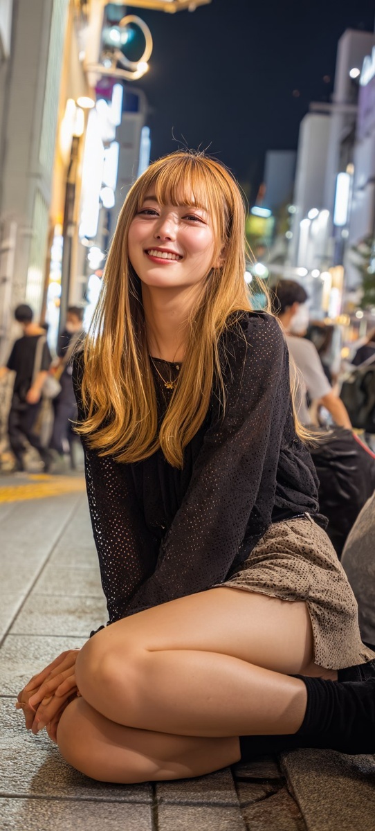 Создано на основе запроса: Japanese 19yo woman, front shot, Nogizaka46, beautiful combed golden long hair, smiling, professional eye make-up, eyeshadow, eyeliner, eyelash perm, eyelash extensions, eyelash perm, professional makeup artist, perfect eyes, knees, quads, mini skirt and perforated shirt, Osaka buildings and night sky, sitting on the side of the sidewalk, pedestrians, quads, triceps, the blinding light of the sun , shot with a Canon EOS R5, highly ,