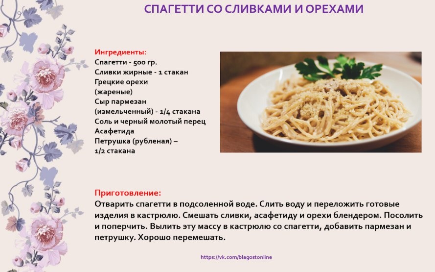 🥣 СПАГЕТТИ СО СЛИВКАМИ И ОРЕХАМИ 🌀 Ингредиенты: Спагетти - 500 гр. Сливки жирные - 1 стакан Грецкие орехи (жареные) Сыр пармезан (измельченный) - 1/4 стакана Соль и черный молотый перец Асафетида Петрушка (рубленая) - 1/2 стакана 🌀 Приготовление: Отварить спагетти в подсоленной воде. Слить воду и переложить готовые изделия в кастрюлю. Смешать сливки, асафетиду и орехи блендером. Посолить и поперчить. Вылить эту массу в кастрюлю со спагетти, добавить пармезан и петрушку. Хорошо перемешать.