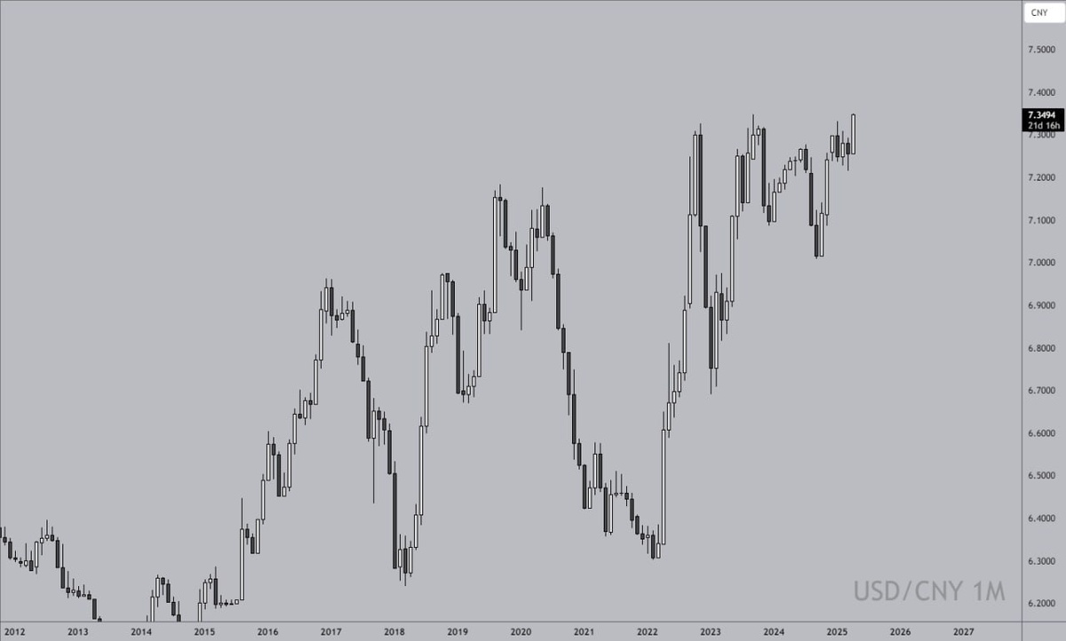 🔸Доллар США достиг самого высокого значения по отношению к китайскому юаню с 2007 года
