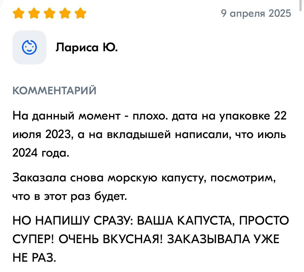 Последнее время идут отзывы про то, что на 500-гр. упаковке морской капусты стоит маркировка 2023 года