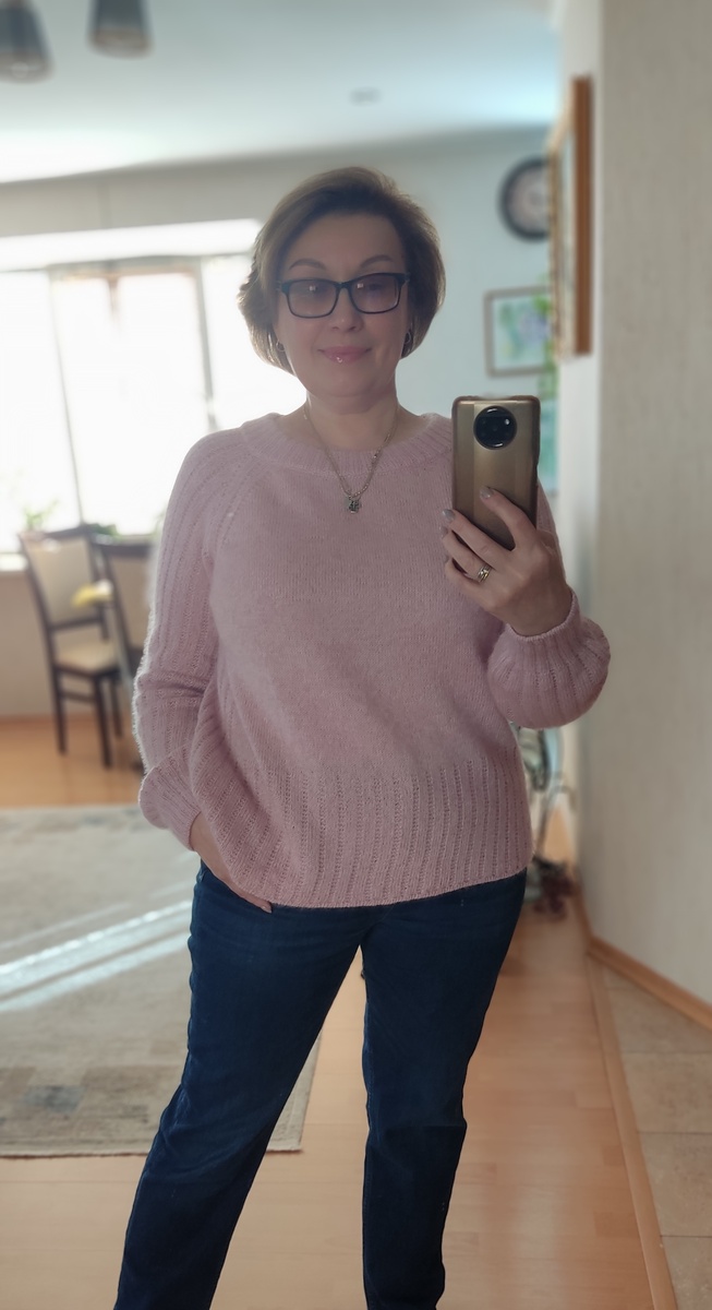 Ура! Мой джемпер "Рохохо" - готов! А почему такое название у этой розовой пушистости? Потому что он - РОзовый, и да - я его очень-очень сильно Хо-Хо. Я его довязала, выкупала и уже выгуливаю. Какой он получился чудесный! После ВТО все петельки - ровные, полотно - гладкое, тактильные ощущения - СКАЗОЧНЫЕ. У меня получилось все что я задумала. Посадка - как я люблю - даже самой очень нравится. Свобода от тела приличная, но не мешок. Длина - самая моя. Очень нравится, как оформлен низ. В субботу жду вас🤗 С удовольствием покажу финал этой работы, а также ещё что-то интересное.