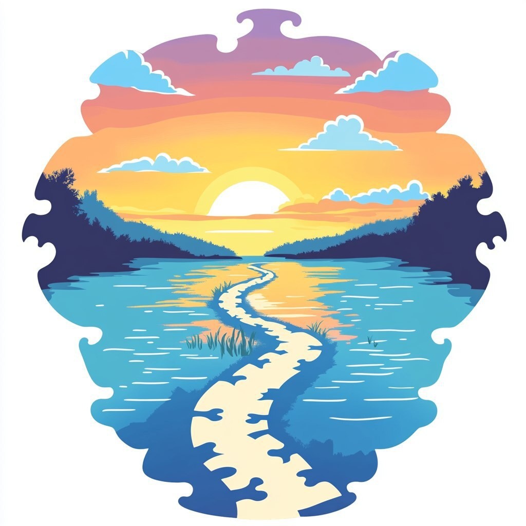 Создано на основе запроса: create a logo with a white background, a cartoon puzzle path on a lake leading to a sunset, make it playful and