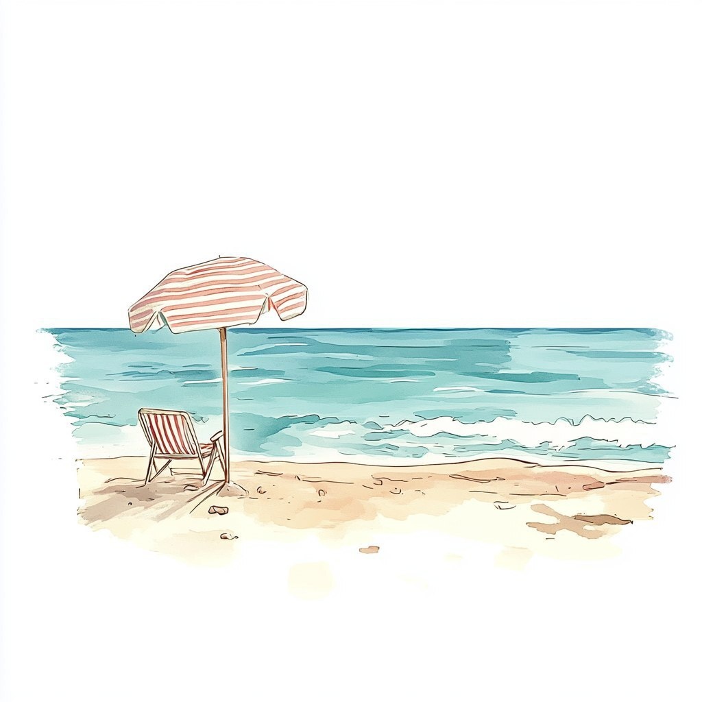 Создано на основе запроса: A peaceful watercolor-style beach scene with soft pastel tones, a striped beach umbrella, a lounge chair, and