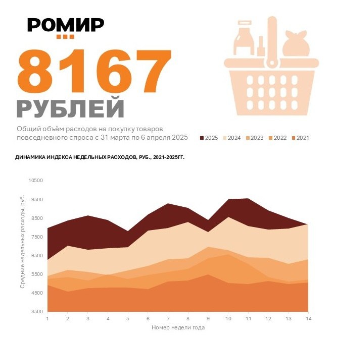 8167 рублей потратила в среднем на продукты питания и товары повседневного спроса среднестатистическая российская семья на неделе с 31 марта по 6 апреля, что на 364 рубля (4.5%) меньше, чем неделей ранее. Относительно аналогичной недели прошлого года объем недельных расходов также снизился на 19 руб. или на 0.2%. Вместо больших покупок с запасом, семьи переходят к более частым, но меньшим по объему посещениям магазинов. Это позволяет лучше контролировать расходы и избегать импульсивных приобретений. #индекснедельныхрасходов #индекспокупательскойактивности @m_romir