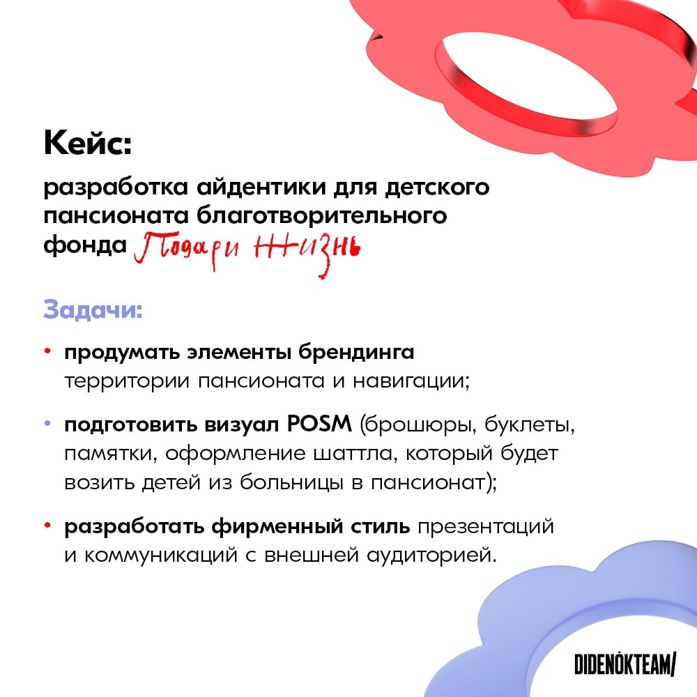 Как мы разработали айдентику детского пансионата в Измалково 🍀 Когда к нам обратился благотворительный фонд «Подари жизнь» с запросом на разработку айдентики для укрепления бренда, мы будто заранее были готовы. Если вы давно с DIDENOK TEAM, то знаете, какое важное место в нашем ДНК занимает благотворительность и помощь. 🔴 За основу айдентики был взят четырехлистный клевер, который символизирует надежду, благополучие и процветание. Дизайнеры разделили клевер четырехконечной звездой — фирменным элементом фонда «Подари жизнь» — и усилили таким образом визуал, создав цветок, состоящий из четырех «сердец». 🟣 Основной цвет — красный, дополнительный — васильковый, чтобы другие брендированные объекты не сливались и не перенасыщали фон. 🔴 Был выбран минималистично строгий, но плавный шрифт Lunasima, который уместно выглядит как на самом логотипе, так и в фирменных материалах. 🟣 Оформление шаттла — отдельное искусство. На самом шаттле, который привозит семьи с детьми, нуждающихся в мед